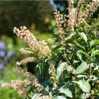 Dass der portugiesische Kirschlorbeer solch ein optischer Blickfang ist, liegt nicht zuletzt an der Familie, aus der die Heckenpflanze kommt. Der mehrjährige portugiesische Kirschlorbeer kommt aus keiner geringeren Familie als der der Rosengewächse. Und die Heckenpflanze macht ihrer familiären Verpflichtung alle Ehre: der portugiesische Kirschlorbeer besticht mit seinen schönen Blütentrauben, die im Frühsommer von ihren Trieben herabhängen und einen tollen Kontrast zu den immergrünen Blättern bilden.
