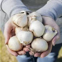 Die Zwiebeln werden in Horsten, also in kleinen Gruppen, gepflanzt. Dabei halten Sie einen Abstand von 5 bis 20 Zentimetern ein – je nach Größe der Blumenzwiebel. Die Spitze der Blumenzwiebel muss nach oben zeigt zeigen. Das Pflanzloch graben Sie etwa zwei- bis dreimal so tief, wie die Zwiebel hoch ist. Die Tiefe ist besonders bei Pflanzen mit schweren Blüten relevant, weil sie andernfalls nicht genügend Halt bekommen und abknicken. Direkt nach dem Einsetzen drücken Sie die Erde an und gießen die Zwiebeln. Bei Trockenheit wird weiterhin regelmäßig gegossen. Übertreiben Sie es aber nicht: Nasse Füße durch Staunässe gefallen keiner Pflanze.
