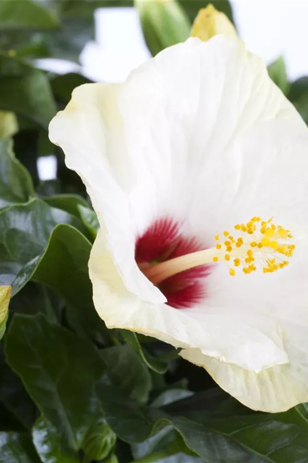 Der Chinesische Roseneibisch (Hibiscus rosa-sinensis) ist eine sehr beliebte Kübelpflanze. Seine gelben, orangefarbenen, rosafarbenen oder roten Blüten sind schalenförmig und erscheinen von Juni bis Oktober.