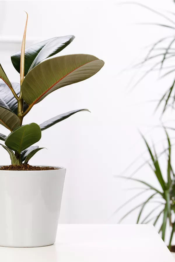 Der Gummibaum (Ficus elastica) trägt dunkelgrüne, glänzende Blätter. Diese aufrechte und verzweigte Pflanze gedeiht am besten an einem halbschattigen Standort.